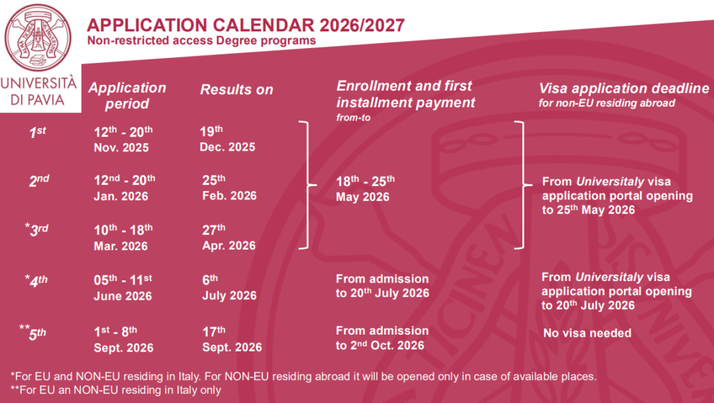- submit a pre-enrollment application to the University of Pavia, which needs to be done online on Universitaly platform. See info at this link.
